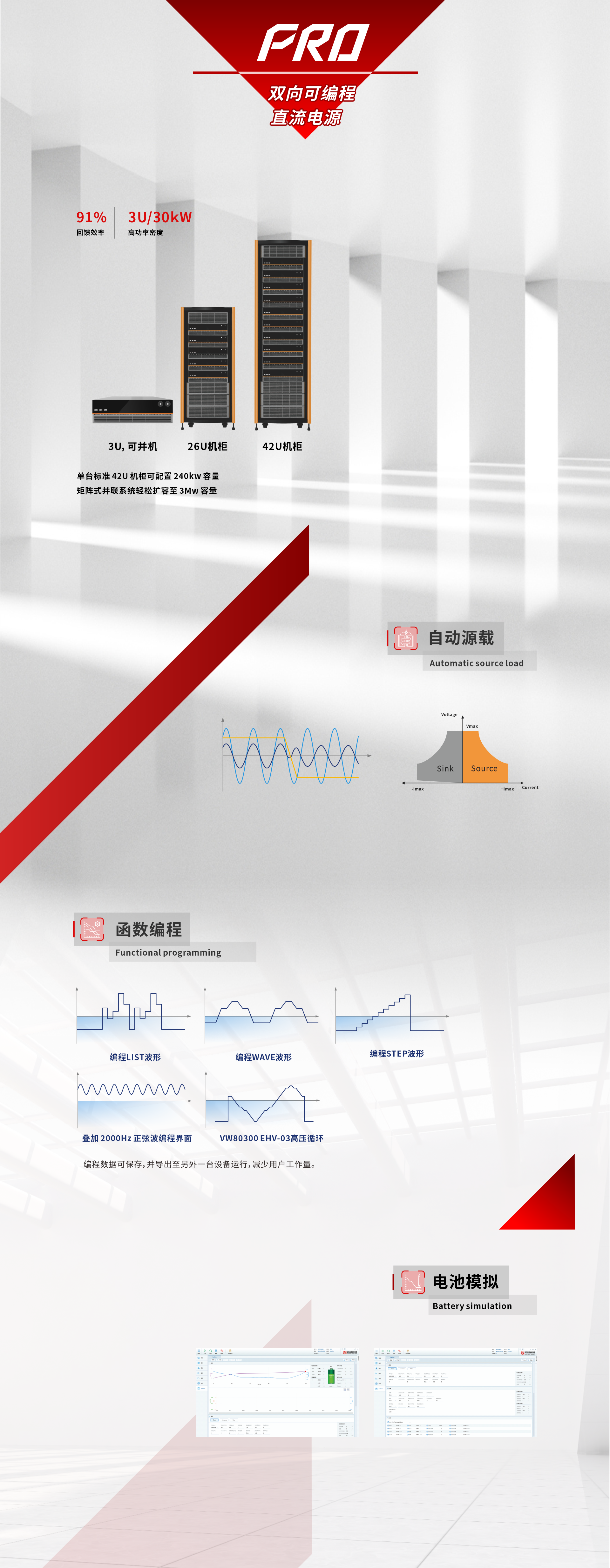 PRD系列產(chǎn)品是愛科賽博推出的新一代雙向可編程直流電源,該產(chǎn)品是一款具有源載功能、自動兩象限運行、能吸收被測試設(shè)備能量回饋的電源。廣泛應(yīng)用于光伏逆變器、儲能變流器、光伏/儲能混合式逆變器系統(tǒng)測試中太陽能電池板模擬、儲能電池/電容模擬等場合。也適用于新能源汽車雙向車載充電器、DC/AC電機(jī)驅(qū)動器、雙向直流變換器模擬電池測試等場合。 內(nèi)置獨立高精度電壓、電流測量系統(tǒng),全新編程理念,直達(dá)源、載本質(zhì)??熘廖⒚肓考壍膭討B(tài)特性,將直流產(chǎn)品測試提升至全新高度,實驗室內(nèi)即可模擬現(xiàn)場異常工況。